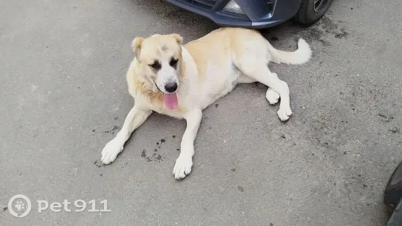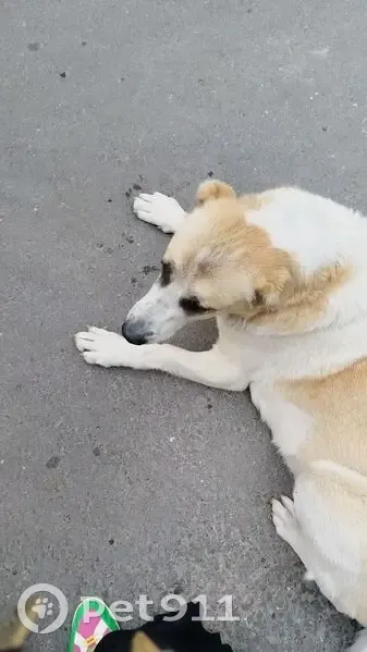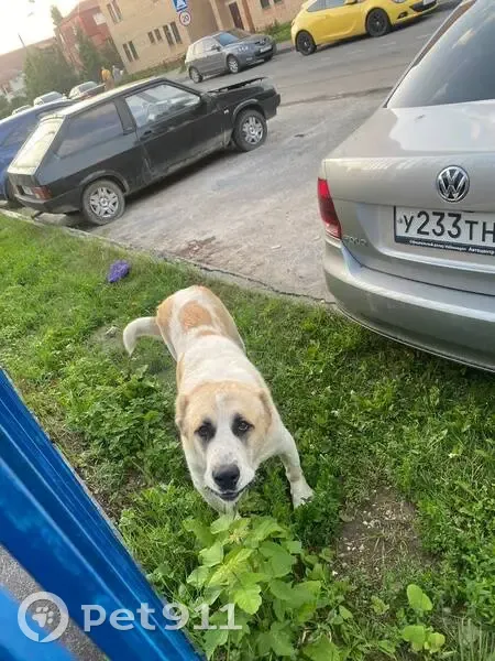 Белая с бежевыми пятнами девочка Алабая. Уши купированные, хвост длинный. К людям доброжелательно, к собакам агрессивна. Бегает за темными машинами, не всеми. Передние лапы кривоваты, ходит будто с трудом. Никто не придержал.
