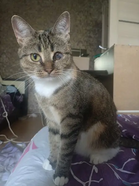 Найдена кошка. Володарский район, улица Гоголя. Окрас серый. Хвост полосатый. Лапы белые в носочках. На левом ухе небольшой вырез.Белая грудка. На носу узкая белая полоска.