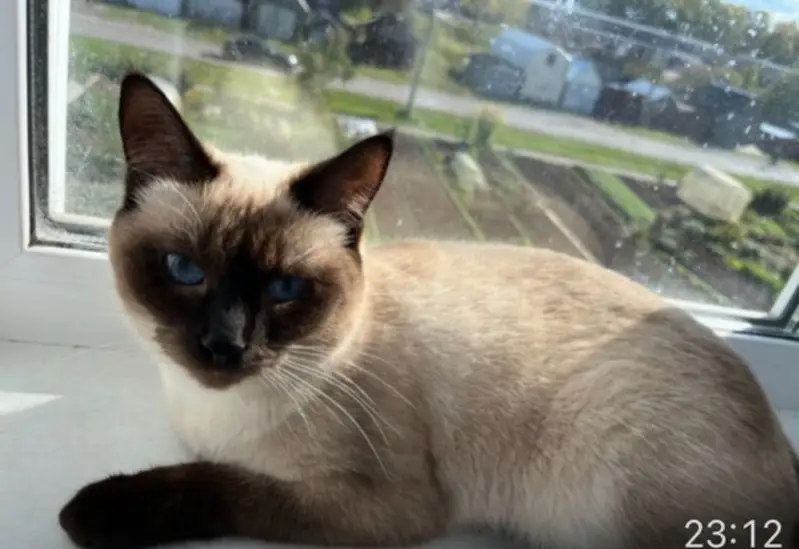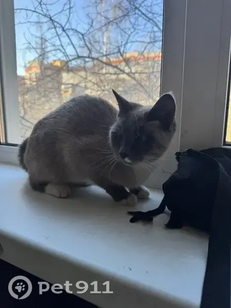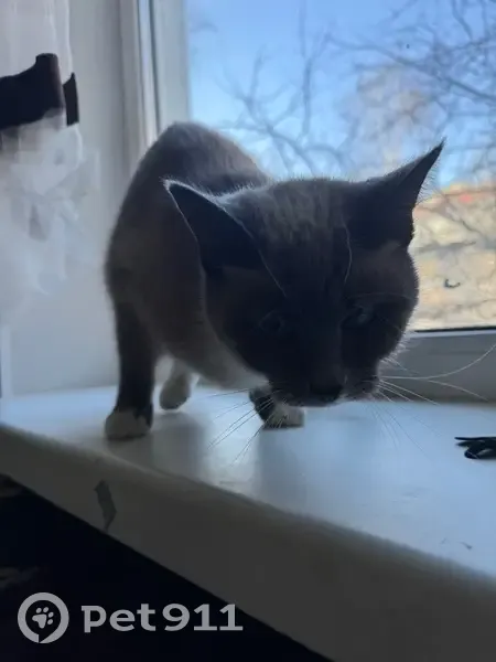 Серый окрас, голубые глаза, на вид месяцев 6, на мордочке белое пятно и лапы белые