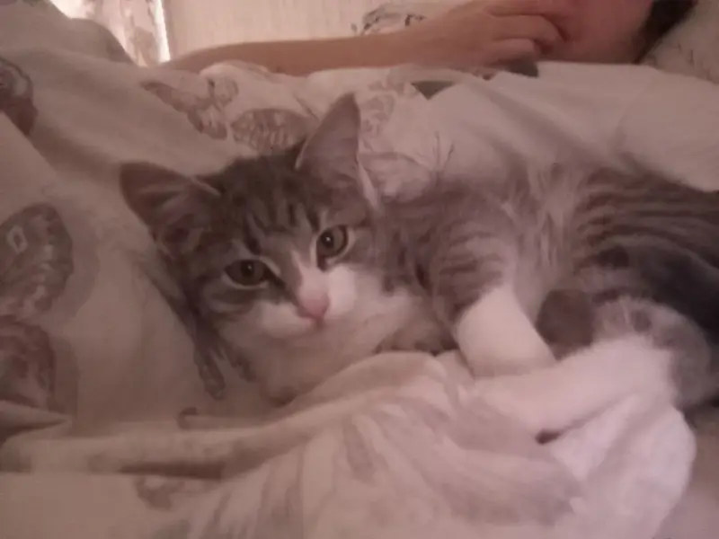 котенок . Серый с белым, мальчик,возраст 3-4 месяца,пушистый и чистенький. В Бежецком районе.Переулок Камвольный 6 район 61 школы.Ищем старых, или новых хозяев.Очень ласковый! Екатерина