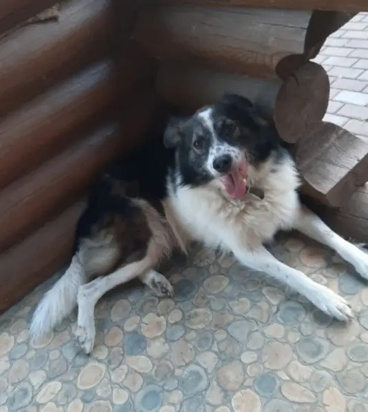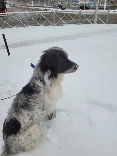 По виду дворняга, черно-белая, лохматый, с ошейником, немного прихрамвает, пришла к нам на улицу, поселилась у соседей возле калитки, кормим её,, мужчин боится, женщин подпускает