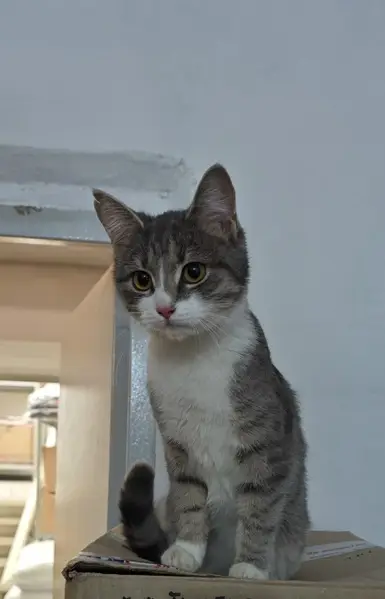 Очень сильно боится людей, не отзывается на кличку, ходит возле ветеринарки вечерами по словам соседей, так же замечено что в пол 4 утра идет со стороны 9 этажек в сторону 79 дома, есть белая грива на фото видно, лапы белые сам полностью серый с небольшими черными полосками