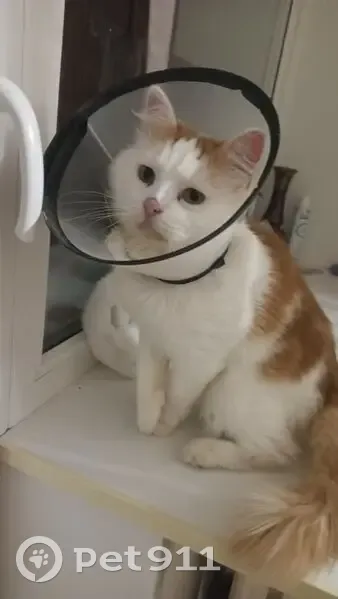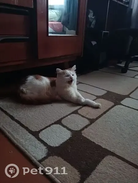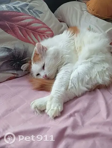 Выскочил ночью в разбитое окно. Пушистый белый с рыжим. Жёлтые глаза На правой лапе выбрита шерсть из-за заросшего абсцесса Большой пушистый рыжий хвост Выражение морды всегда грустное