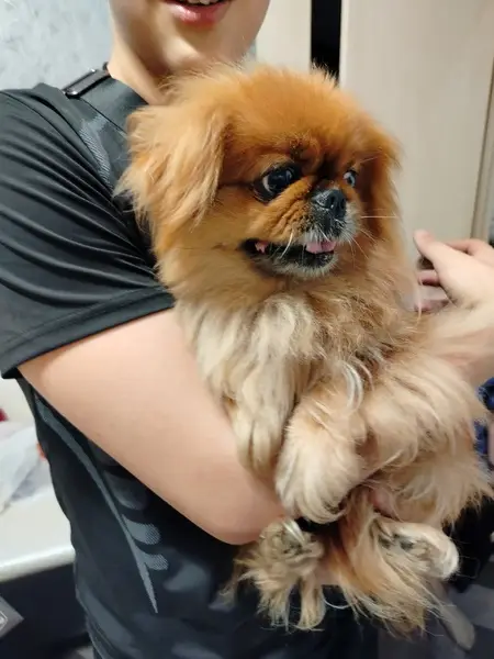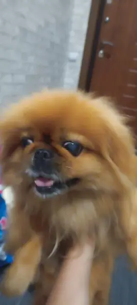 Рыже пепельный чёрный возраст-7 лет, особые приметы, нет нижнего клыка. Порода пекинес.