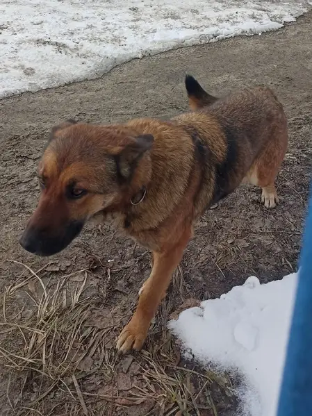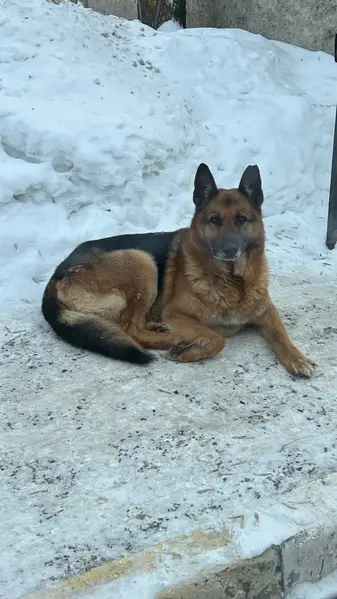 Найдена собака. Немецкая овчарка, сука, старая, левое ухо не поднимается На ней ошейник, собака упитанная, видно, что домашняя. Брянский район, деревня Дубровка (Новые Дарковичи), в районе улицы Брянской прибилась к нам на прогулке 24.01.25. Спокойная, ласковая. Ищем хозяина, старого или нового.