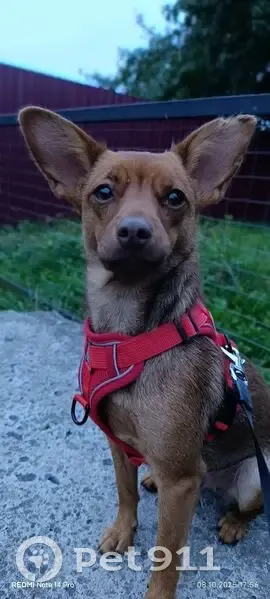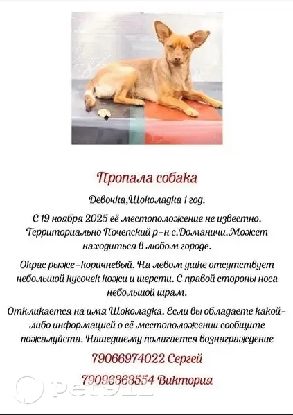 19.11.25 убежала в неизвестном направлении Окрас рыже-коричневый, На левом ушке нет кусочка кожи и шерсти. На носике с левой стороны есть небольшой шрам. По размеру небольшая