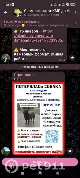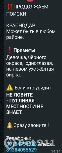 Объединено с объявлением rl1131872. Причина-дублирование информации. Описание дублирующего объявления: Собачка чёрного окраса, нет Правого глазика, на левом ушке жёлтая бирка, пожалуйста присмотритесь, может быть в любом районе Краснодара