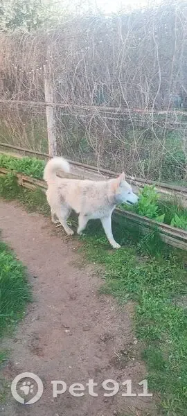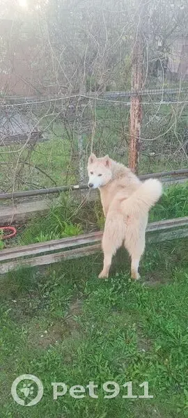 Хаски бежевого цвета, кабель.Собака шла за сыном и не отходила от него. Пришла на участок и находится на нем. Калитку открытую оставляли он выходит и возвращается. Очень добрый и ласковый
