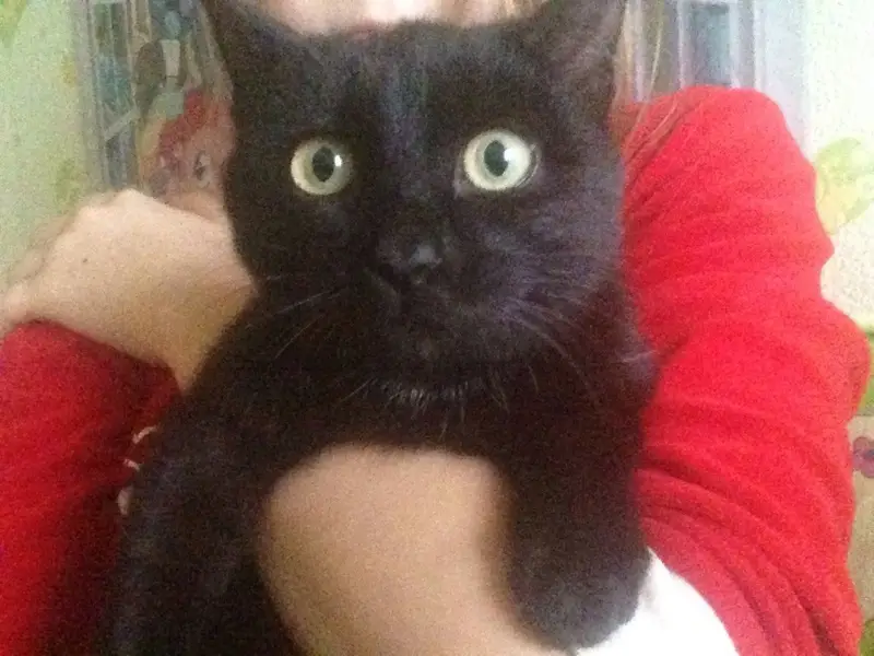 Черный домашний кот, на шее белая бабочка, в паху белое пятно, орал беспрерывно, очерь ласковый, ручной