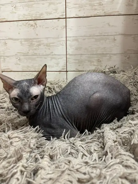 Домашняя кошечка , сфинкс ( лысая ) на ушках мордочке и хвостике есть шерсть . На взгляд похожа на 3х цветную .