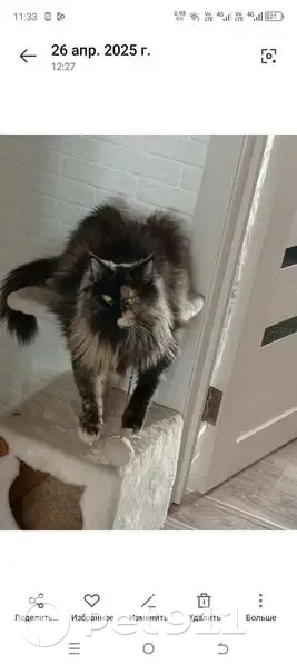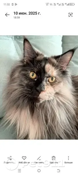 Окрас трехшерстный, мордочка поделена на 2 части цветом. Есть шрам (стерилизация), одна из молочных желез на ощупь чувствуется (небольшая шишка) Пушистая.
