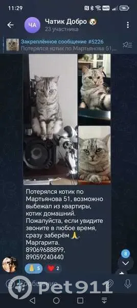 7 сентября, вечером, в районе дома по Мартьянова 51,потерялся кот, откликается на кличку Мартин, пожалуйста, кто видел просьба сообщить по телефону 8906 968 88 99 Потерялся друг семьи, очень переживает ребенок Вознаграждение гарантируем!