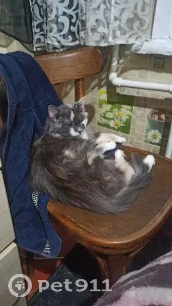 Длинная шерсть, Трëхшорстная-серые, белые и светло рыжие пятна, жёлтые глаза, очень ласковая и доверчивая может в полне если подозвать подойти к незнакомцу, дети открыли дверь из квартиры в подъезд и на прошмыгнула, а на улицу видать кто из соседий выпустил