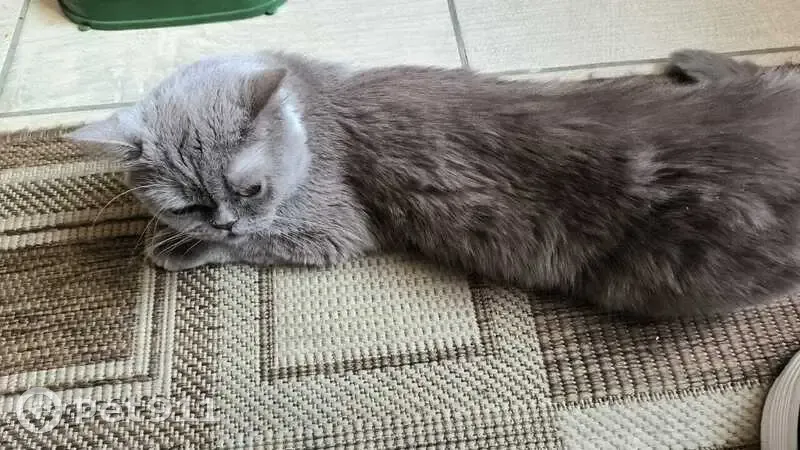 Трёхцветная шотландская вислоухая кошка. Найд...