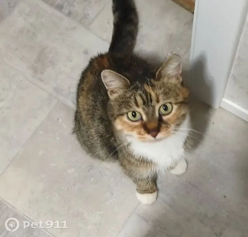 Кошка трёхцветная, белые лапки и грудка, стер...