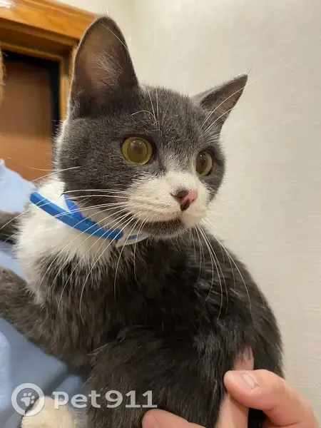 Молодой котик в синем ошейнике, ухоженный, ла...