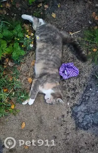 Нашли кошку окрас чёрный, белый, серый полоса...