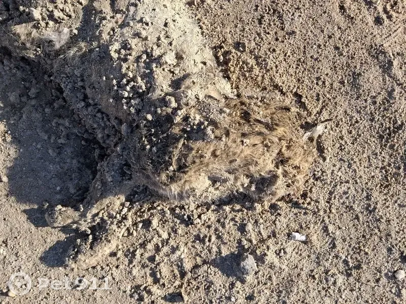 Мертвая кошка серого, возможно, рыжего цвета....