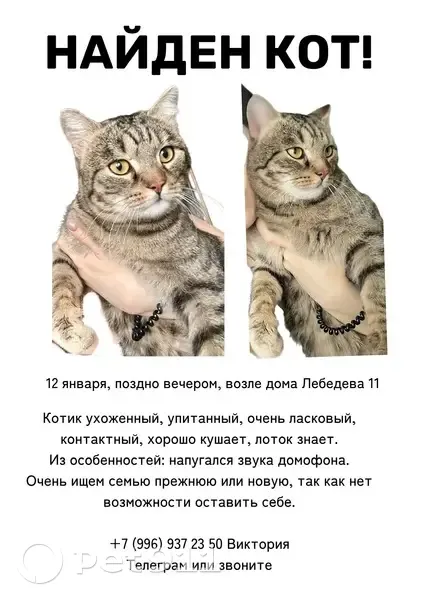 Кошка найдена: ул. Пушкина, 52...