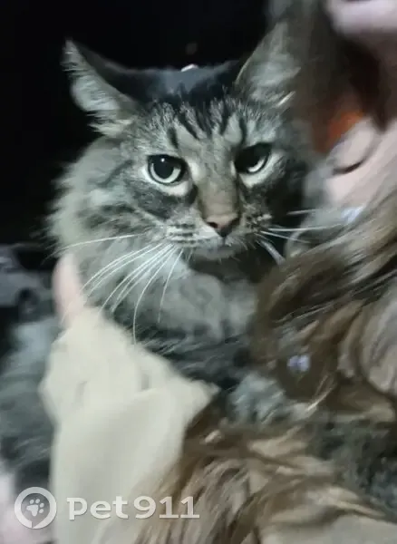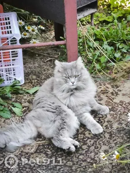 Найден кот. Пушистый, серый с белым, глаза зе...