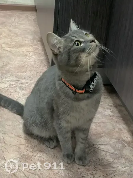 Серая кошка, зелёные глазки, оранжевый ошейни...