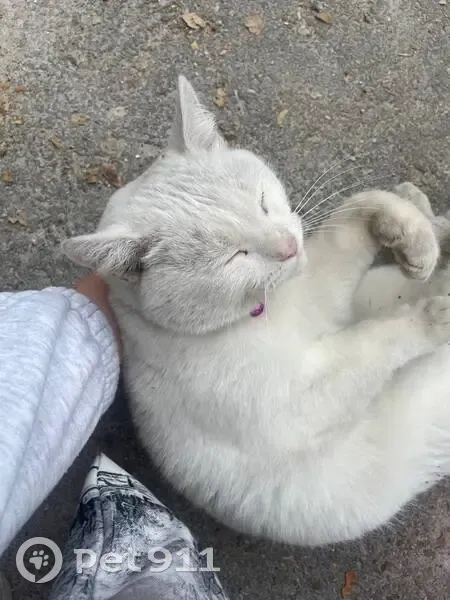 Белый кот,на шее розовый ошейник! Очень ласко...
