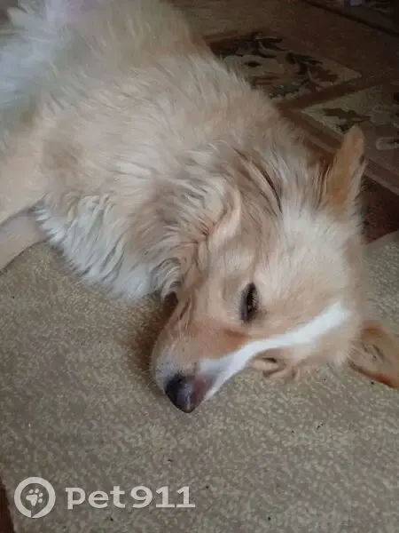 Рыжий окрас, на шее ошейник с корабином. Ласк...