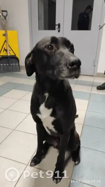 Найдена черная собака, на груди белое пятно....