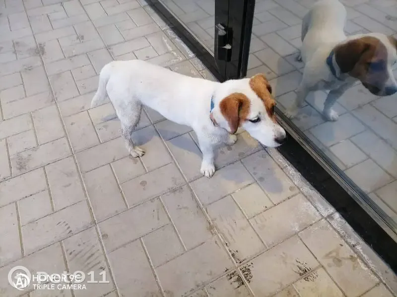 Джек-рассел, сука. На собаке синий ошейник, к...