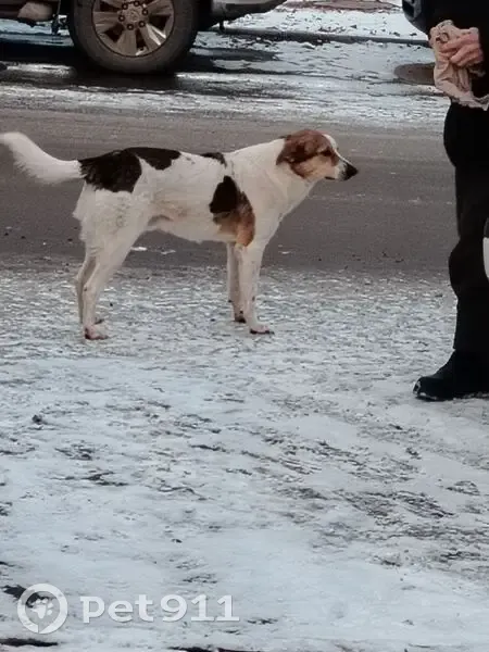 Найдена собака. Белая с пятнами. Самец. Есть...