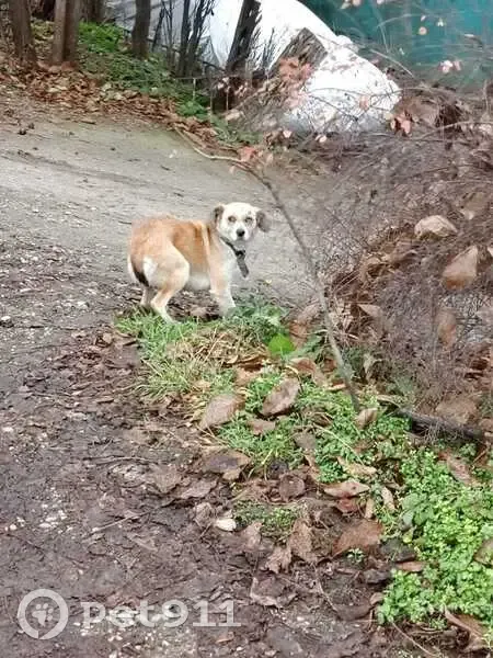 Рыжая с белым небольшая собачка с ошейником....