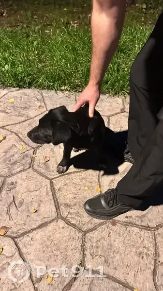 Черная собака, ухоженная, есть ошейник, но бе...