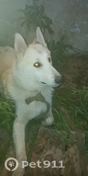 Белая, похожа на лайку, шерсть выгоревшая на...