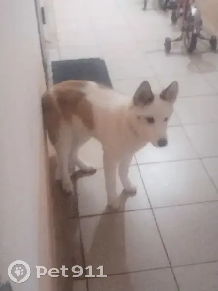 Белая с бежевыми пятнами. Молодой пёс. Тонкий...