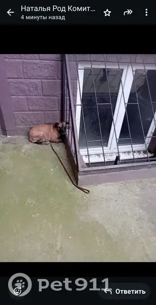 Пёсик испуган, с поводком, лежит возле 3 подъ...