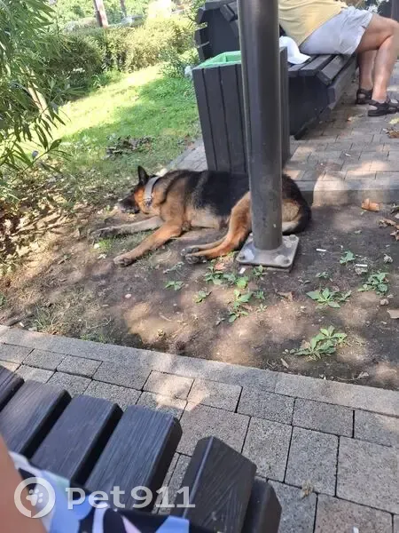 Овчарка с ошейником. Лежит, грустит, хозяина...