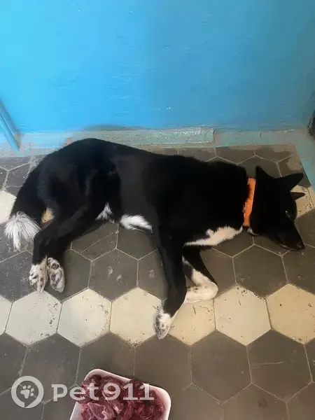 Окрас чёрно-белый, есть оранжевый ошейник. Си...