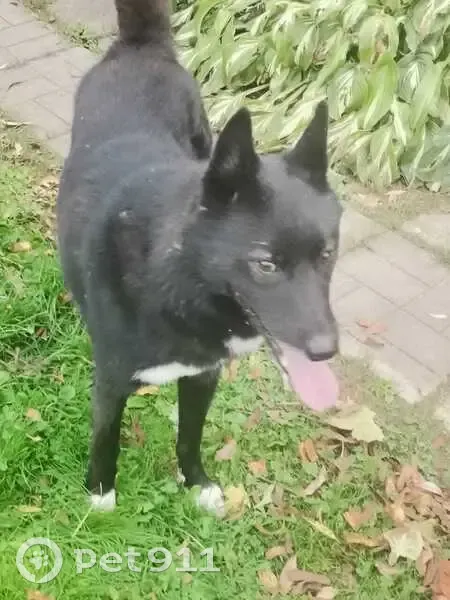 Похож на лайку. Черный с белыми лапами и груд...