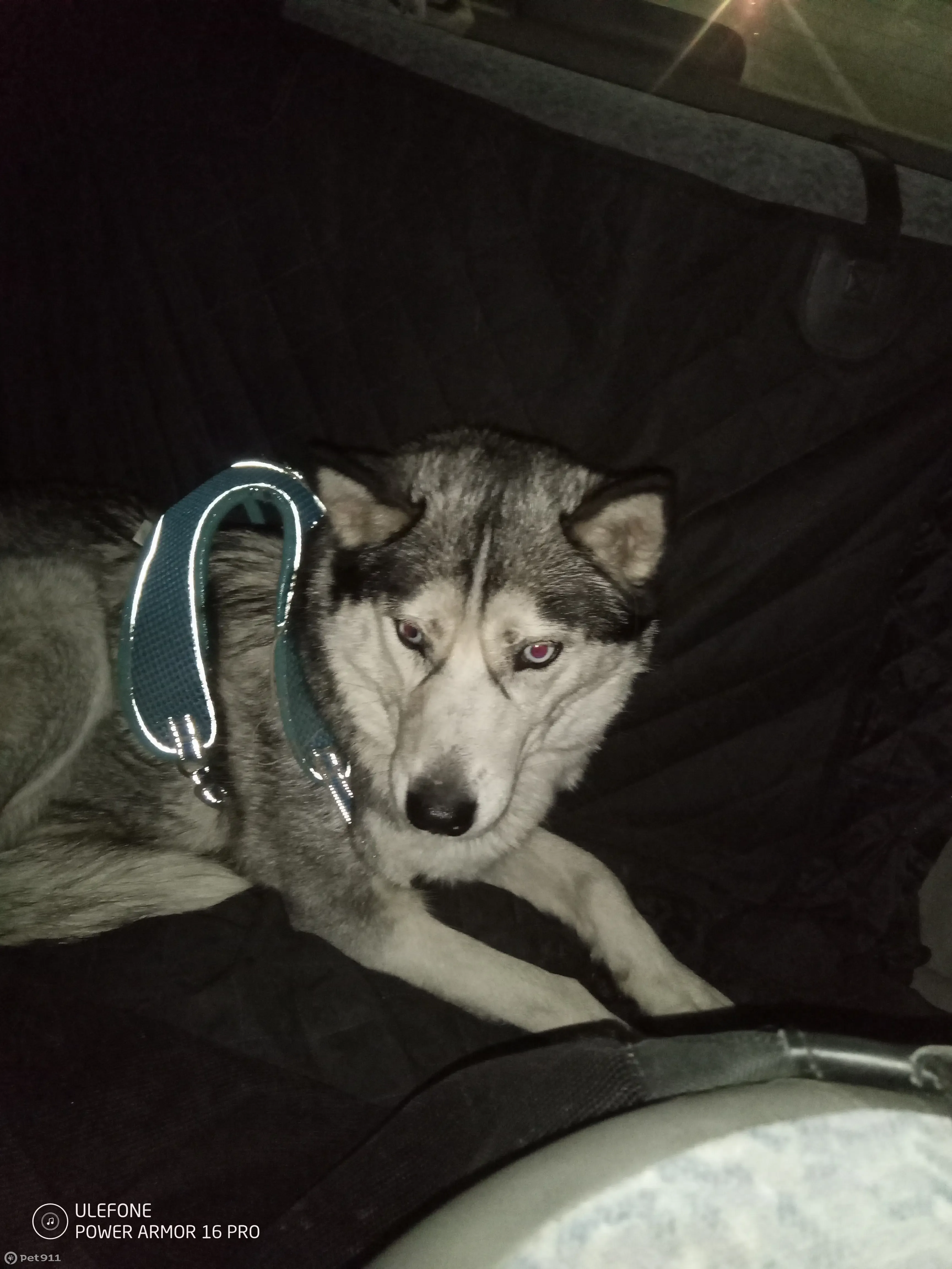 Хаски , Сука серо белая ,с голубой шлейкой...