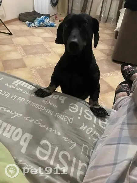 Чёрная собака, дружелюбный. Откликается на "С...
