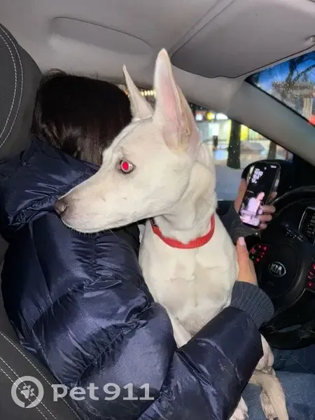 Белая с красным ошейником, глаза разного цвет...