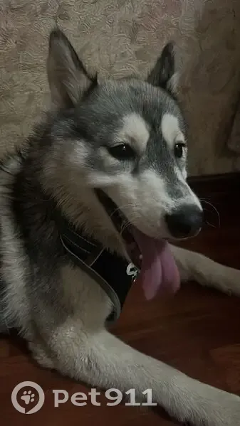 Собака (хаски?), молодая, в серой шлейке. Ище...