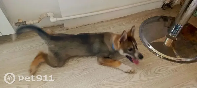 Щенок похож на хаски. Карие глаза. На нем кож...