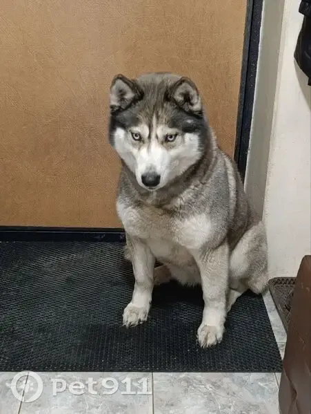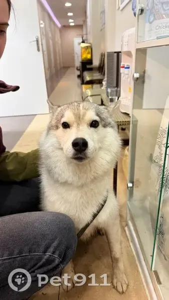 Хаски (метис), черно-белый окрас, ошейник с б...