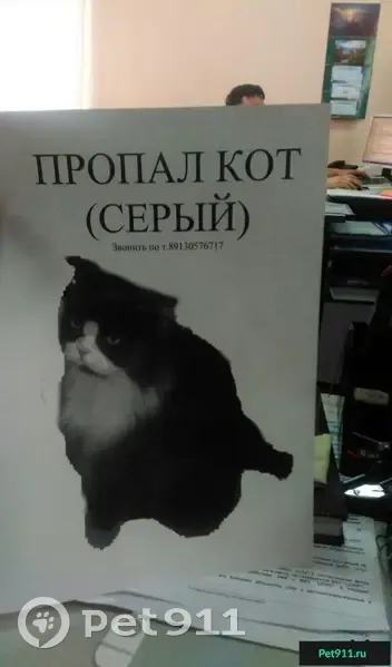 Пропал серый кот, пушистый, крупный. В районе...
