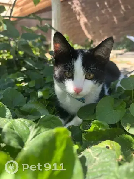 Черно-белый окрас. Жёлтые глаза. Голубой ошей...