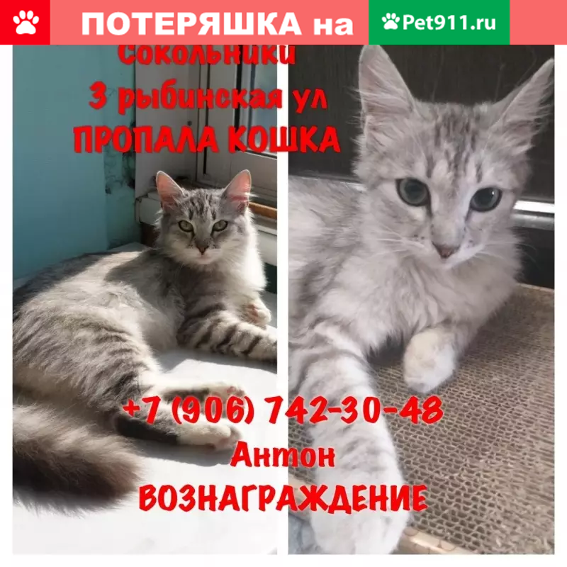 ПРОПАЛА КОШЕЧКА! 4 месяца. Окрас серый, похо...