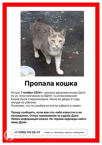 Ночью 7 ноября 2024 г. Пропала дворовая кошка...