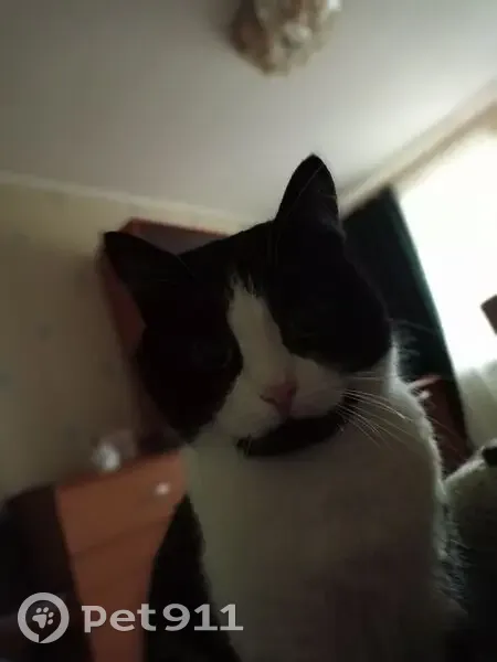 Черно-белый кот, пушистый, пугливый. Кличка-А...