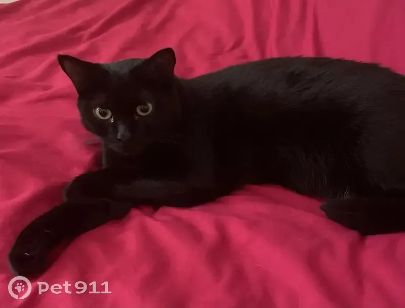 Черная гладкошерстная, зеленые глаза, на пузи...